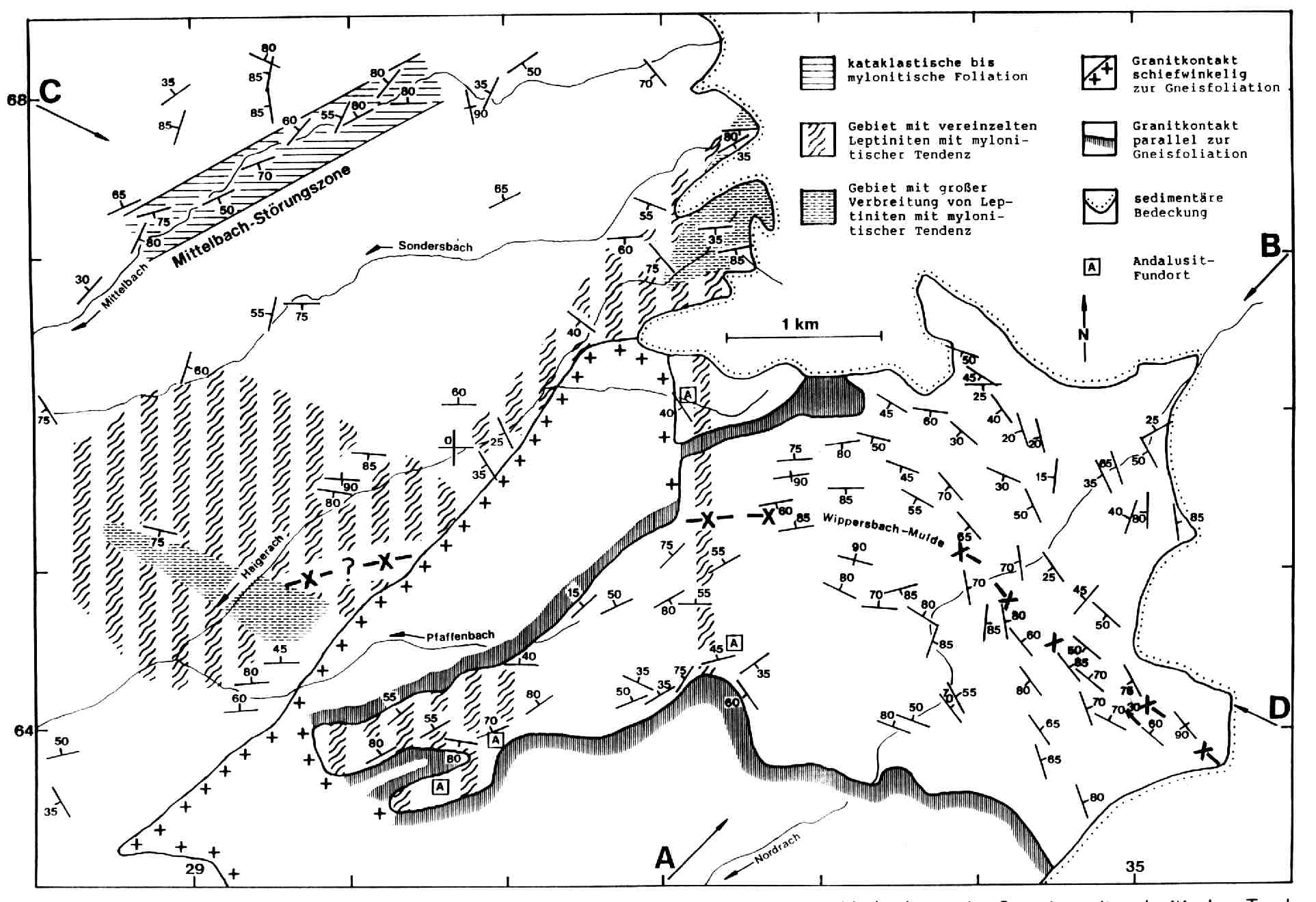 Abb. 5: Strukturplan des engeren Arbeitsgebietes. Raumlage der prägenden Foliation, Verbreitung der Gesteine mit mylonitischer Tendenz und Raumlage des Granitkontaktes (mit kontaktbedingten Andalusit-Vorkommen)