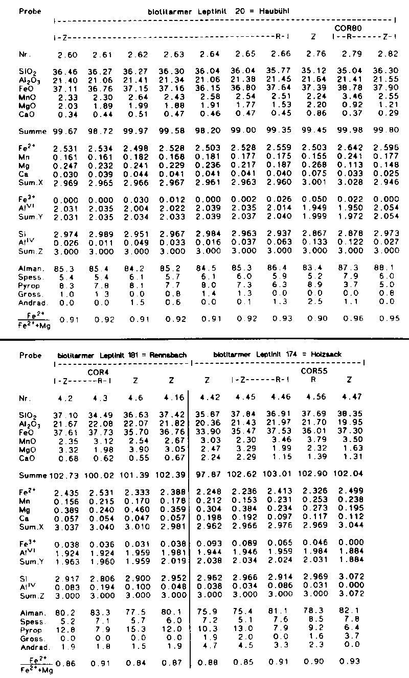 Tab. 8: Granat-Analysen (Mikrosonde) der biotitarmen Leptinite 20 = Haubühl, 181 = Rennsbach und 174 = Holzsack