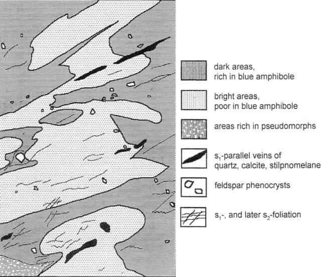 The petrographic study revealed that in the schist of probable greywacke-origin albite, quartz, ferriphengite, riebeckite/magnesio-riebeckite, stilpnomelane, titanite, hematite and magnetite form the metamorphic paragenesis proper. K-feldspar is present only as part of the pseudomorphs and as a few phenocrysts. Epidote and chlorite are rare and seem to be relictic phases that were mostly consumed by metamorphic reactions. Other low grade phases such as clinozoisite, actinolite, zeolite, pumpellyite or lawsonite are absent. At the time when foliation s1 formed, s1-parallel veins opened and were filled with calcite, quarz and stilpnomelane. It is noteworthy that probable aragonite was described a few kilometers away by RITTER (1884). With the methods used here, the possibility of the presense of aragonite in the sample investigated, cannot be excluded.