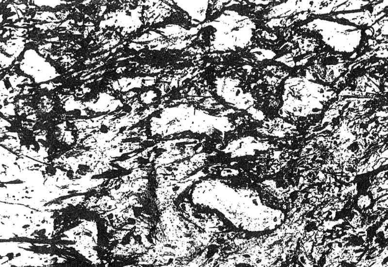 The heterogeneous appearence of the rock in outcrop is reflected also in its appearence in thin section (Fig. 2) where it can be subdivided in partly folded layers and lenses distinguishable by colour, dominating minerals, grain size and frequency of characteristic pseudomorphs. A few phenocrysts of feldspar (0.1 to 1 mm in size) are scattered in a fine-grained matrix. The rock is cut by the dominating foliation s1 and a second oblique to it (s2).