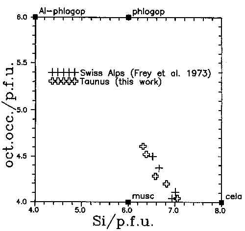 Fig. 4: Plot of Si versus octahedral occupancy of micas from the Taunus schist and similar glauconites from metamorphic limestones of the Swiss helvetic alps (FREY et al. 1973). All Fe was calculated as Fe3+. The plot demonstrates the trend from dioctahedral towards triocahedral compositions. For comparision the compositions of the endmembers muscovite, celadonite, Al-phlogopite and phlogopite are given.
