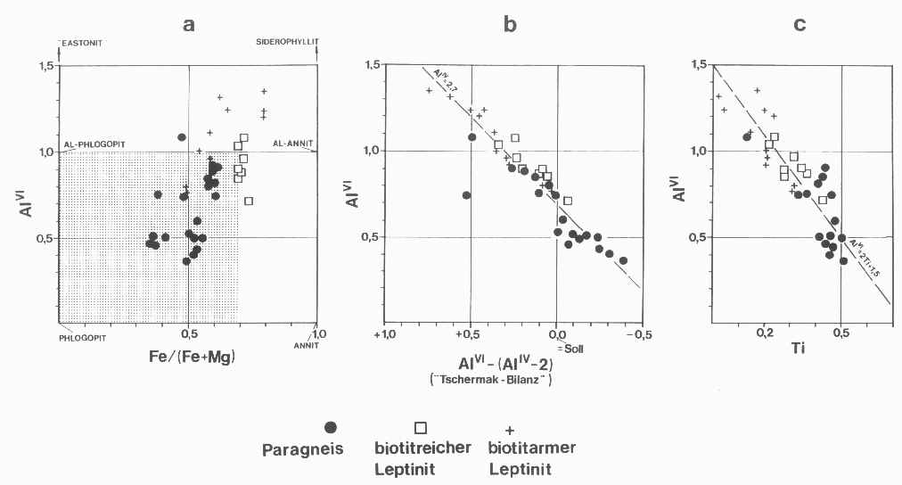 Abb. 40: Verhältnisse verschiedener Atome im Biotit-Kristallgitter aus den untersuchten Metamorphiten. Zum Vergleich ist in a das Feld metamorpher Biotite nach GUIDOTTI (1984, gerastert) angegeben