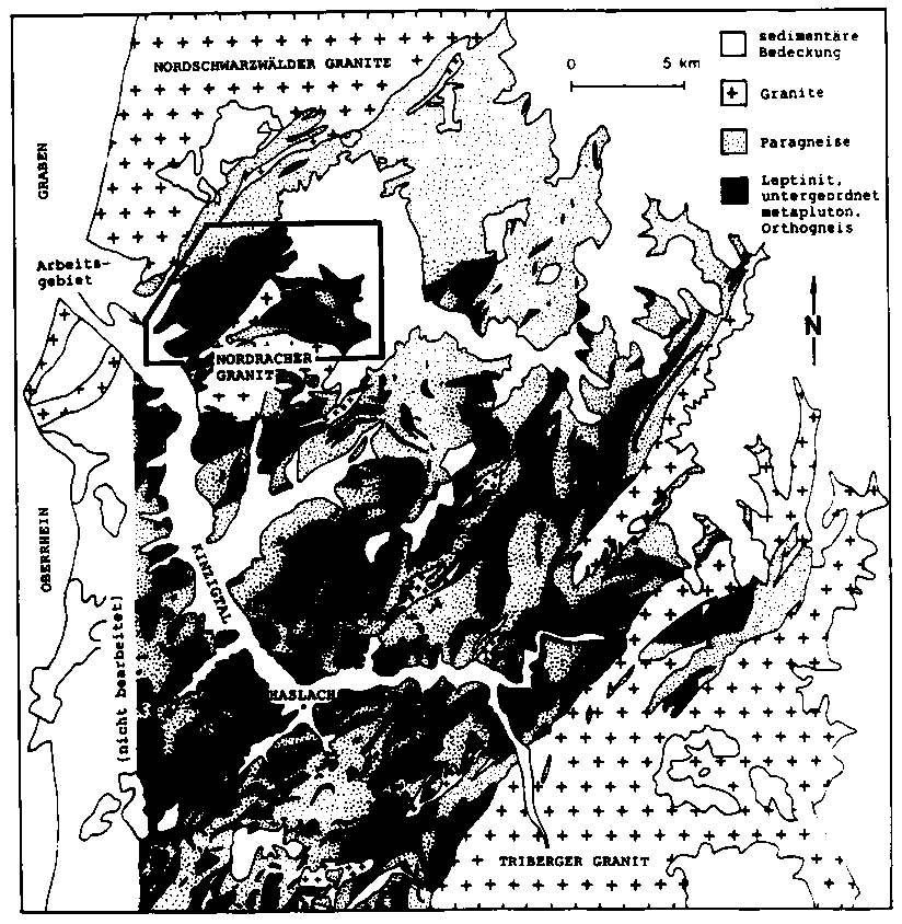 Das Grundgebirge des Schwarzwalds konnte von WIMMENAUER (1984) in verschiedene lithologische Assoziationen gegliedert werden. Feinkörnige, leukokrate Quarz-Feldspat-Gesteine, die Leptinite, stellten dabei ein wesentliches Gliederungs-Kriterium dar. Unter anderem gliederte WIMMENAUER (1984: 80) das "Leptinitmassiv von Nordrach" aus.