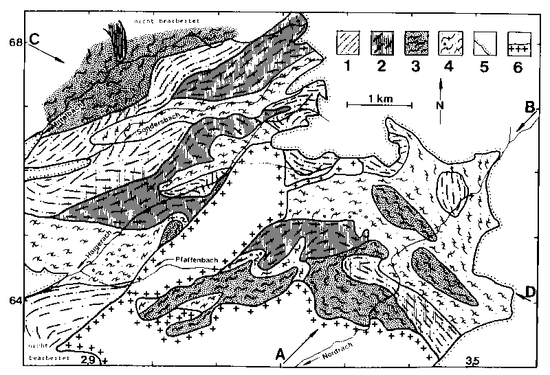 Abb. 4: Lithologisch-strukturelle Karte des engeren Arbeitsgebietes und Lage der Profile (A-B, C-D). 1 = homogene, biotitarme Leptinit-Körper, 2 = homogene, biotitreiche Leptinit-Körper, 3 = homogene Paragneise, 4 = Wechsellagerung zwischen 1 und 3 (Kreise: zusätzliche 2), 5 = Deckgebirge: Rotliegendes, Buntsandstein und Quartär, 6 = Nordracher Granit