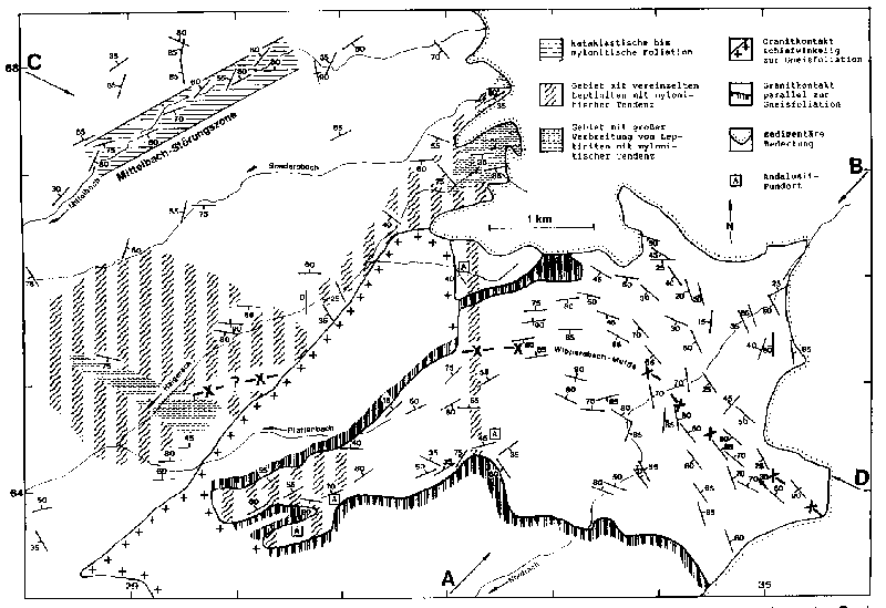 Abb. 5: Strukturplan des engeren Arbeitsgebietes. Raumlage der prägenden Foliation, Verbreitung der Gesteine mit mylonitischer Tendenz und Raumlage des Granitkontaktes (mit kontaktbedingten Andalusit-Vorkommen)
