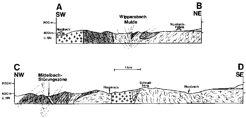 Das metamorphe Grundgebirge wird dominiert von Leptiniten und Paragneisen. THÜRACH (1897) gliederte die Paragneise in Rench- und Kinzigitgneise. Die Kinzigitgneise unterscheiden sich durch ihren Granatreichtum und ihr metablastisches, körneliges Gefüge von den anderen Paragneisen. In das metamorphe Grundgebirge intrudierte im Unterkarbon der Oberkircher Granit, der an seinem SE-Kontakt durch ein basisches Hornblende-Biotit-Gestein mit großen, idiomorphen Kalifeldspäten (Durbachit) begrenzt wird. Der kleine Nordracher Granit ist noch nicht radiometrisch datiert, gehört aber petroraphisch zur Gruppe der oberkarbonischen Zweiglimmer-Granite des Nordschwarzwalds. In der Zone Diersburg-Berghaupten sind kohleführende Sedimente und Vulkanite aus dem Zeitraum Namur bis Westfal mit Gneisen und Graniten in einer S-gerichteten Störungszone verschuppt (WILSER 1935, STEPANEK 1987). In streichender Verlängerung dieser Zone wurden im Mittelbachtal kataklastisch bis mylonitisch deformierte Gneise gefunden (Mittelbach-Störungszone). Das Grundgebirge wird diskordant von geringmächtiger, variszischer Molasse des Oberkarbons und Perms (Tonsteine, Arkosen, Rhyolithe u.a.) überlagert. Mächtiger Buntsandstein schließt das Profil nach oben hin ab. Im Eozän begann die Einsenkung des Oberrhein-Grabens. Die Täler sind mit quartärem Schutt gefüllt.