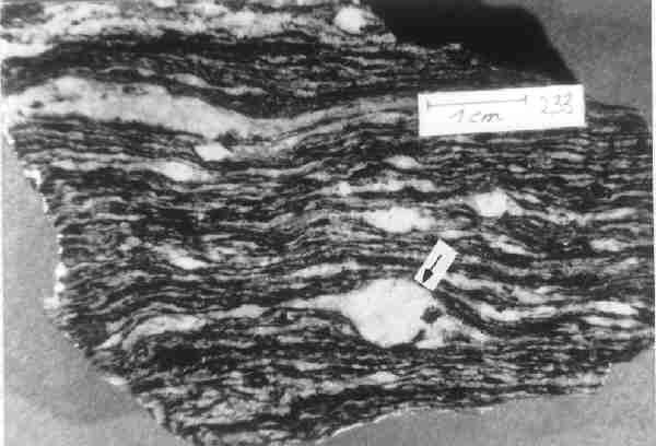 Abb. 23: Mylonitischer metapelitischer Paragneis 233 = Kohlberg. Der große leukokrate Klast (Pfeil) besteht aus einem Quarz-Plagioklas-Aggregat. In den leukokraten Lagen kommen um 20 µm große stengelige Andalusit-Aggregate vor.