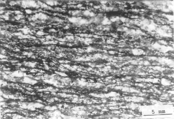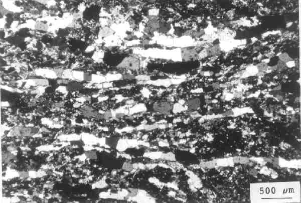 Abb. 24: Mylonitisches Gefüge des Paragneises 308 = Sorben. Zwischen rekristallisierten Plattenquarzen befindet sich eine feinkörnige Quarz-Feldspat-Matrix. Gekreuzte Nicols