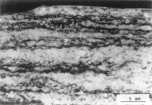 Abb. 28: Migmatischer Paragneis 57 = Bärhag. Die dunklen Lagen und Flecken sind pinitisierter Cordierit und untergeordnet Biotit