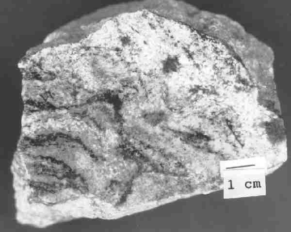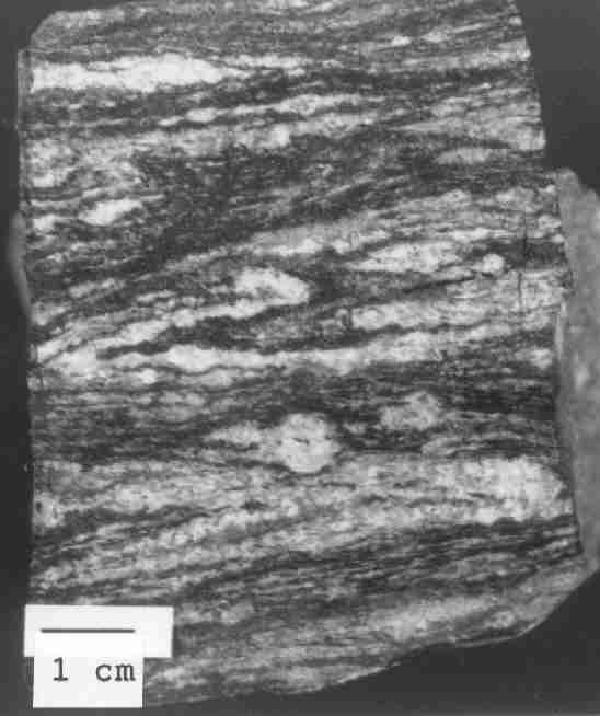 Abb. 29: Lagiger, metapelitischer, Kyanit führender Paragneis mit verfalteten leukokraten Lagen. Probe 547 = Schuckenhof