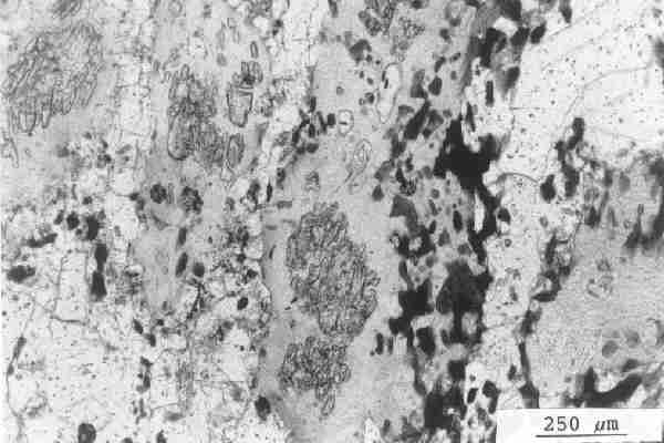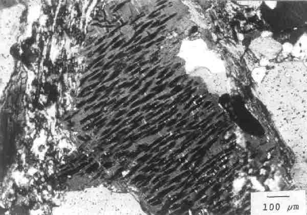 Abb. 31: Paragneis 308 = Sorben, der das post-mylonitische statische Cordieritisierungs-Stadium in typischer Weise zeigt: breite Cordierit-Säume um Dist-Sillimanite (Pseudomorphose aus Sillimanit nach Kyanit) und Cordierit mit rundlichen Biotit-Einschlüssen. Parallel Nicols