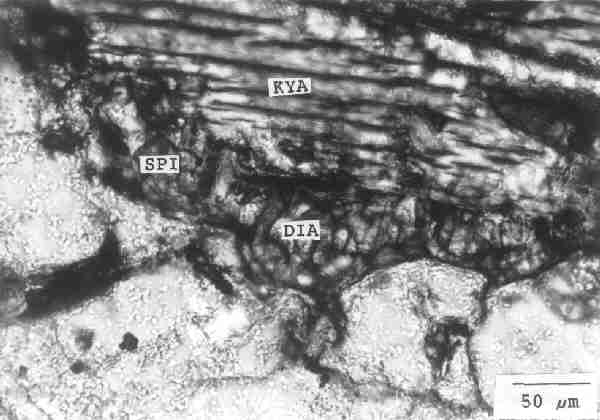 Abb. 32: Spinell(SPI)-Diaspor(DIA)-Corona um Kyanit(KYA). Paragneis 346a = Schönberg. Parallele Nicols