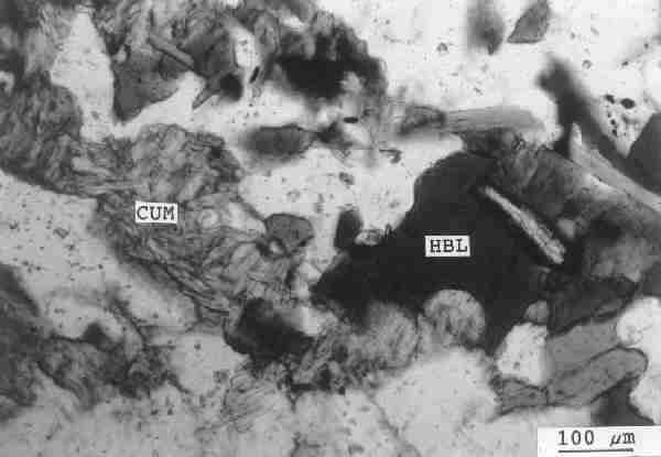 Braune Hornblende (Ferro-tschermakitische Hornblende, Mikrosonden-Analyse in Tab. 3) ist der dominierende Amphibol, daneben tritt Cummingtonit (Abb. 33, Tab. 3) in faserigen Aggregaten auf. Diese sind gelegentlich idiomorph umgrenzt; es könnte sich um dabei um Pseudomorphosen nach Orthopyroxen handeln. Dieser vermutete Orthopyroxen verdrängte die braune Hornblende und Biotit. Der braune Biotit ist mit 8 % relativ häufig. Der Plagioklas (An um 40 %) ist zoniert und zeigt teilweise antipertische Entmischung. Granat (Almandin 57 Mol-%, Pyrop 16 %, Grossular 26 %, Spessartin 2 %, Tab. 3) kommt nur als vereinzelte, reliktische Körner mit Plagioklas-Saum vor. Quarz kommt in wenigen Prozenten vor. Ilmenit bildet symplektit-ähnliche Einschlüsse in Hornblende. Die Gehalte an Apatit und Zirkon (idiomorphe Säulen) sind hoch. Die leukokraten Lagen sind recht grobkörnig und bestehen aus Quarz, Plagioklas (große Körner randlich rekristallisiert, teilweise antipertitisch), wenig Biotit. Ein 3 mm großer Titanit wird randlich von einem symplektit-ähnlichen Ilmenit verdrängt. Pyrrhotin und Chalcopyrit treten akzessorisch auf. Bei der makroskopischen Betrachtung des Dünnschliffs fallen im Amphibolit helle, 5 mm große, rundliche Flecken aus Plagioklas und Hornblende auf. Es handelt sich wahrscheinlich um Granat-Pseudomorphosen.