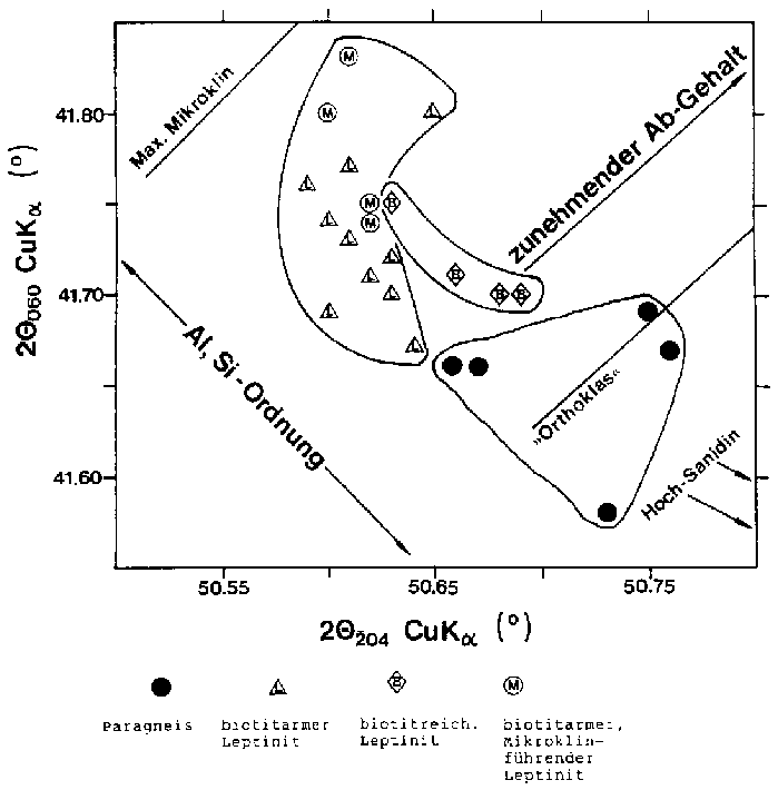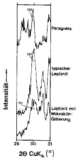 Alle Leptinite und einige Paragneise sind so reich an Alkalifeldspat (15 - 37 %), dass an Gesamtgesteins-Pulverpräparaten der Strukturzustand des Alkalifeldspats gemessen werden kann. Dies ist sicher keine Präzisions-Methode, aber für einen Überblick ausreichend.