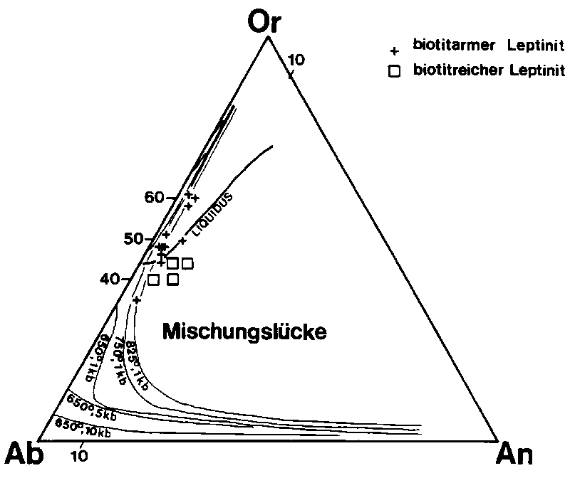 Abb. 36: Darstellung der Feldspat-Komponenten der Leptinite (CIPW-Norm der Gesteine). Die Solvi nach SECK (1971a,b) sollen die metamorphen Bedingungen beleuchten. LIQUIDUS ist die Projektion der quarzgesättigten Zwei-Feldspat-Liquidus-Grenzkurve für 1 kbar pH2O nach JAMES & HAMILTON (1969) und soll das Rhyolith-Edukt der Leptinite belegen.