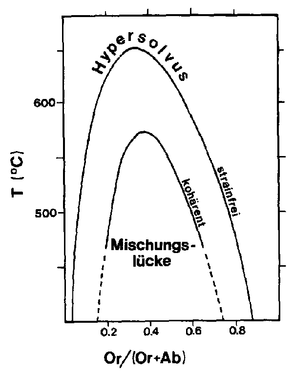 Abb. 37: Strainfreier und kohärenter Alkalifeldspat-Solvus nach YUND & TULLIS (1983: 165). Sanidin-Hochalbit-Serie bei 1 bar