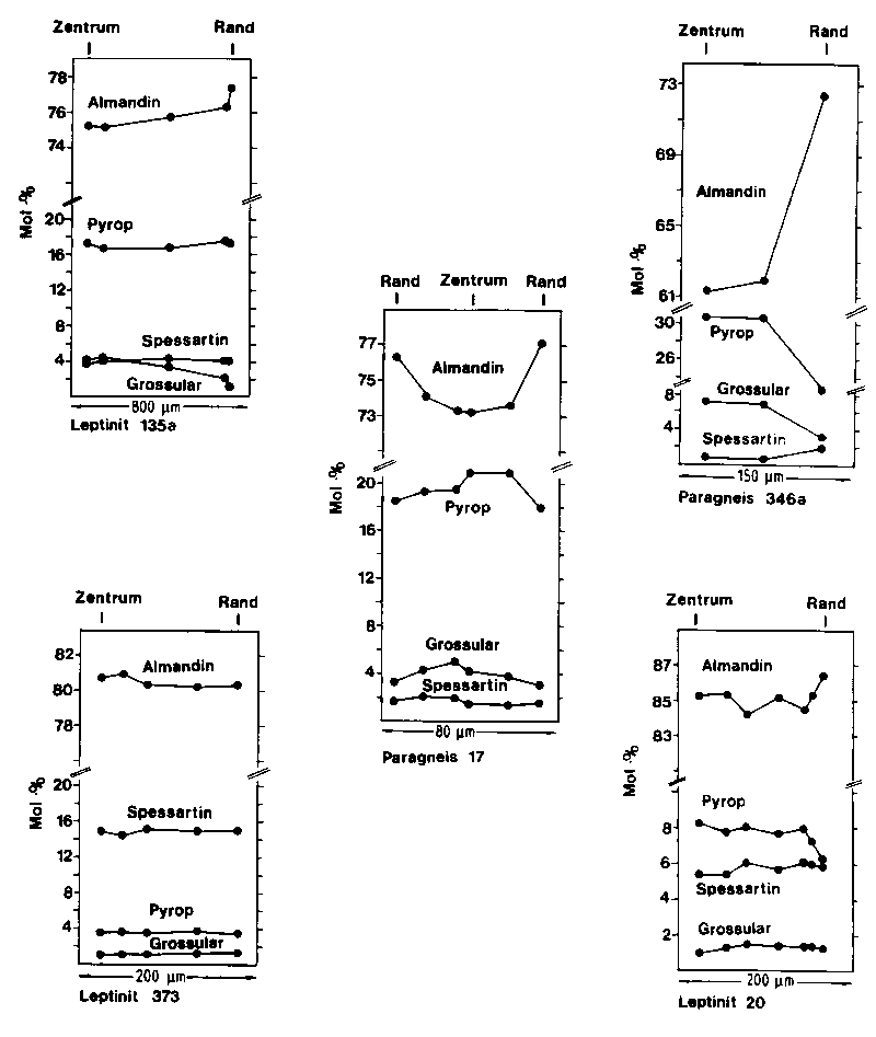 In der Paragneis-Probe 17 = Hochkopf wurde festgestellt, dass homogene Pinite nahezu das gleiche Fe/(Fe+Mg)-Verhältnis aufweisen wie die frischen Cordierite. Nimmt man dies auch in anderen Proben als gegeben an, kann das Fe/(Fe+Mg)-Verhältnis der Pinite die ehemaligen Cordierite näher charakterisieren. Die meisten Pinite haben ein Fe/(Fe+Mg)-Verhältnis zwischen 0,36 und 0,55. In dem biotitarmen Leptinit Probe 20 = Haubühl kommt dagegen eine sehr Fe-reiche Pinit-Corona (Fe/(Fe+Mg) = 0,77) um Granat (Granat-Rand: Fe/(Fe+Mg) = 0,96) vor. Da der Verteilungs-Koeffizient KDFeMg zwischen Granat und Cordierit bzw. Pinit sehr ähnlich dem eines frischen Granat-Cordierit-Paares im Paragneis 17 ist, ist in Probe 20, bedingt durch die Fe-reiche Gesteins-Zusammensetzung die ehemalige Existenz eines Fe-Cordierits wahrscheinlich (vgl. Cordierit-Granat-Thermometer). Solch Fe-reiche Cordierite um Granat treten auch in böhmischen Weißstein-Granuliten auf (FEDIUKOVA & FEDIUK 1971: 40).