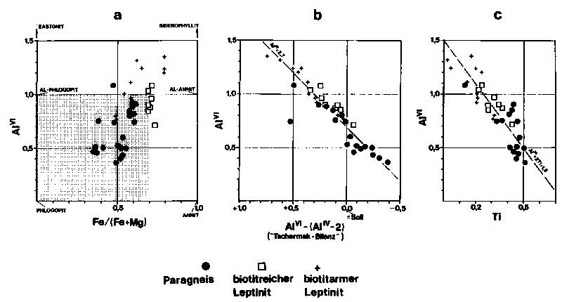 Der AlVI-Gehalt der untersuchten Biotite umfasst das weite Feld von 0,37 bis 1,35. Die Paragneise zeigen dabei die geringsten, die biotitreichen Leptinite mittlere und die biotitarmen Leptinite die höchsten AlVI-Gehalte. Nach GUIDOTTIs Zusammenstellung überschreiten die metamorphen Biotite von Metapeliten einen AlVI-Gehalt von 1,0 praktisch nicht (gerastertes Feld in Abb. 40a). Diese Grenze wird aber nicht von der Kristallstruktur, sondern von der Gesteinszusammensetzung bestimmt. In Experimenten konnten in Fe-Biotiten bis 1,50 AlVI-Atome je Formeleinheit eingebaut werden (HEWITT & WONES 1975, zitiert in GUIDOTTI). Der AlVI-Gehalt wird meist mit der