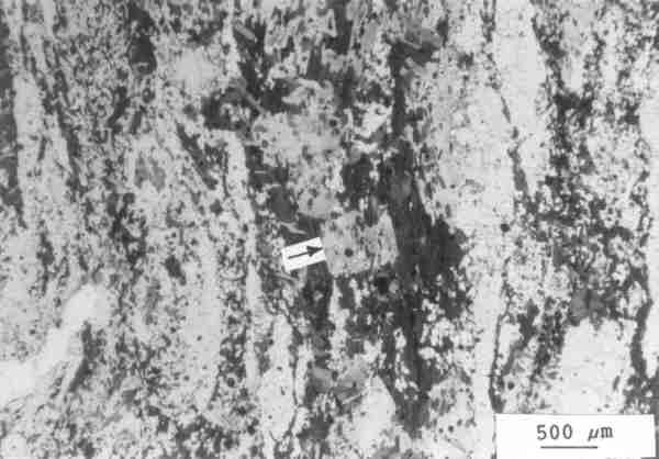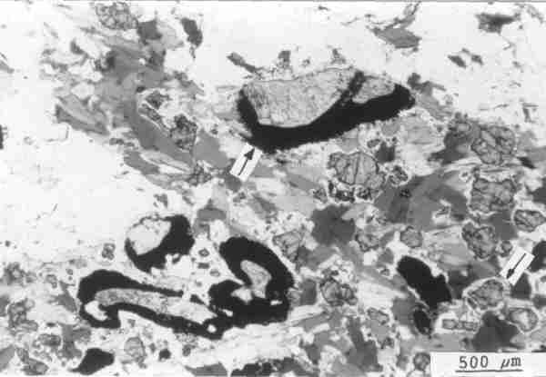 Abb. 41: Mylonitischer Paragneis mit späterer Blastese von idiomorphem (Pfeil) und xenomorphem Cordierit. Der Cordierit schließt Biotit, Ilmenit, Quarz und Disth-Sillimanit ein. Probe 308 = Sorben