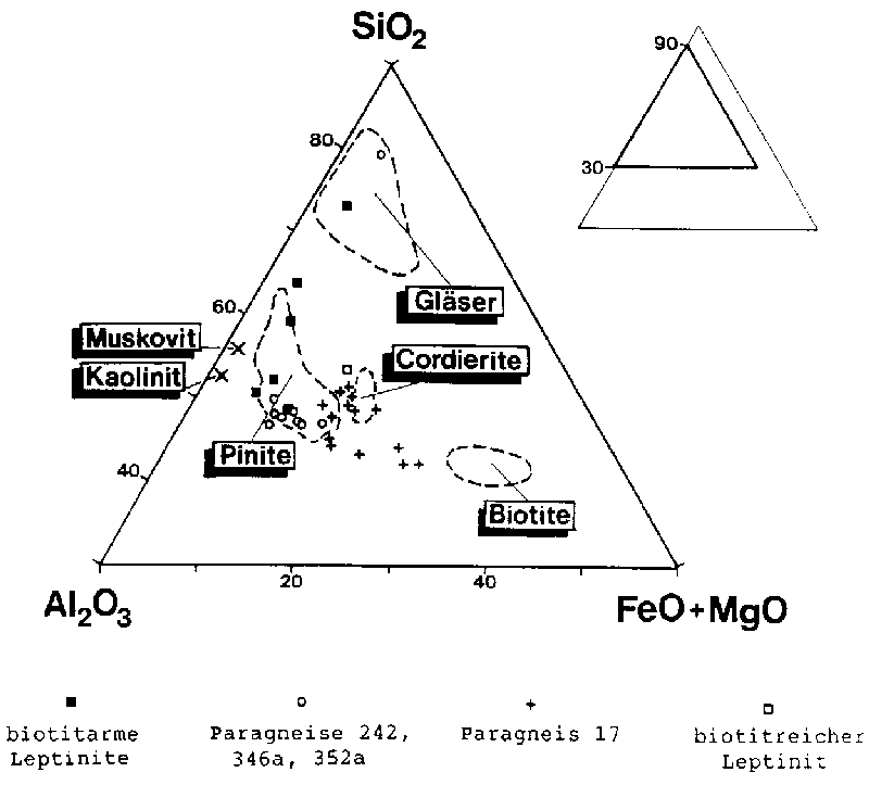 Die hier analysierten Pinite ergaben ein weites Feld ihrer Zusammensetzung (Tab. 13 im Anhang). In Abb. 42 wurde die Analysen in das SiO2 - Al2O3 - (FeO+MgO) - Dreieck nach MARCHAND et al. (1982: 442) eingetragen. Auch die Felder für Biotite, Cordierite, Pinite und Gläser aus Biotiten und Cordieriten wurden aus dieser Arbeit übernommen. Die analysierten Pinite der Paragneis-Probe 17 = Hochkopf erweitern MARCHANDs Pinitfeld in Richtung auf das Biotitfeld. Pinite aus den biotitarmen Leptiniten 174 = Holzsack und dem Paragneis 346a = Schönberg fallen in das Feld von Gläsern, die bei der Aufschmelzung von Biotit oder Cordierit gebildet werden. Der Vergleich der gesamten Analyse dieser Pinite untereinander und mit einem Biotit-Glas (LE MAITRE 1974: 409) zeigt aber große Unterschiede: