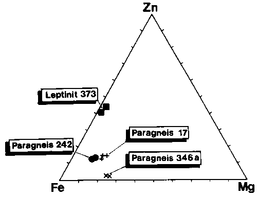 Die Probe 181 = Rennsbach liegt im Dreieck der Abb. 42 zwischen dem Pinitfeld und dem Gläserfeld. Bei den Analysen der Pinite darf nicht mit der sonst üblichen Präzision gerechnet werden, da diese schlecht poliert waren und mit unverändert kleinem Elektronenstrahl-Durchmesser gearbeitet wurde. Die Analysen zeigen aber, da die Ansichten von NEDELEC & PAQUET nicht so abwegig sind, wie MARCHAND et al. und CLEMENS & MCMILLAN annahmen.