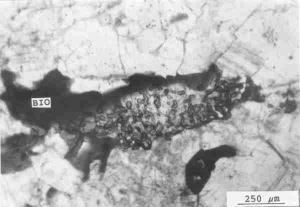 Abb. 45: Würmchenförmige Spinell-Körnchen sind hellverglimmertem ?Cordierit verwachsen (Wachstum auf Kosten von ?Biotit (BIO)). Seltenheit in den biotitarmen Leptiniten. Probe 20 = Haubühl. Parallele Nicols