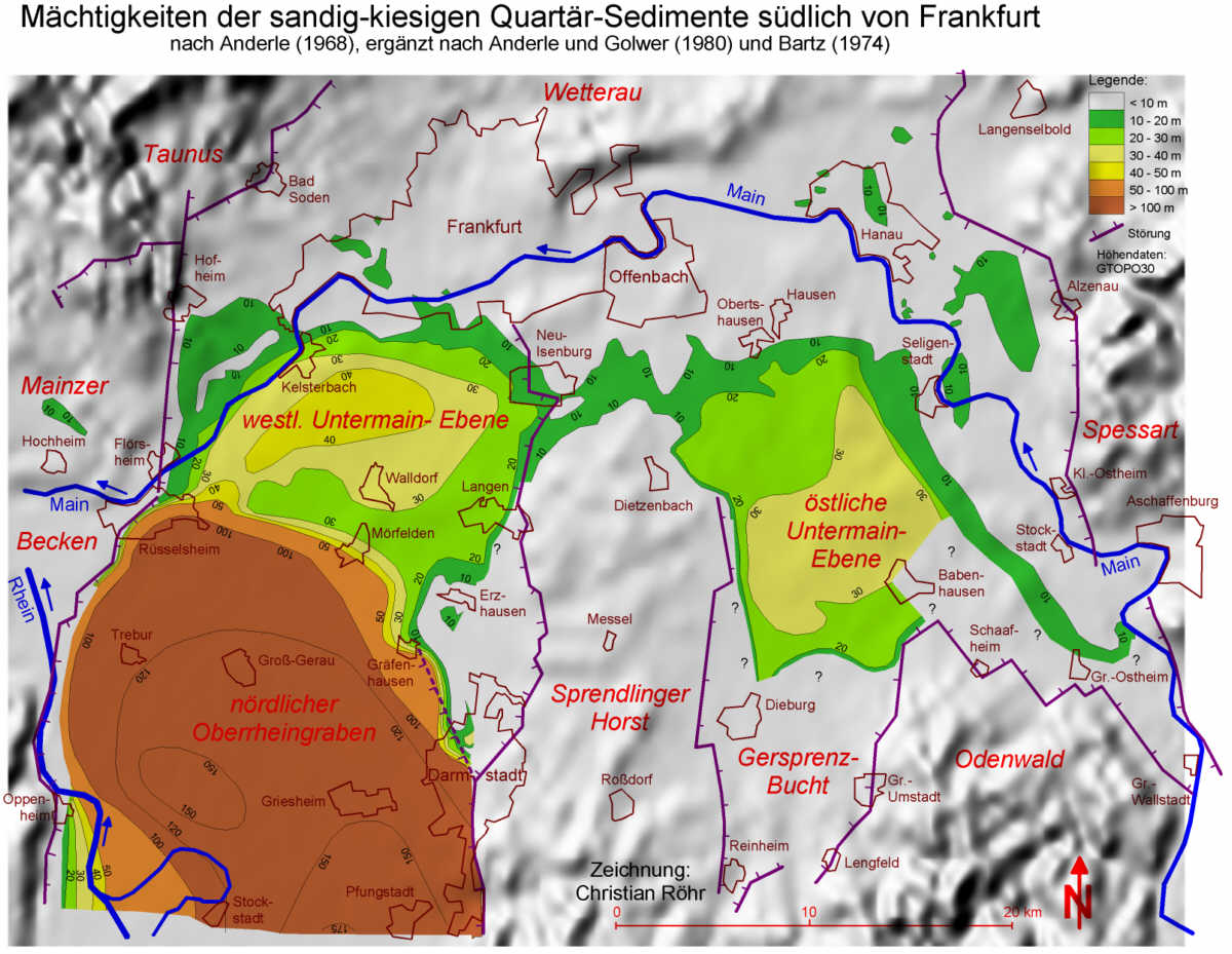 Die mächtige Grabenfüllung des Oberrheingrabens endet im Norden etwa auf der Höhe von Rüsselsheim. Von Süden her bis dort hin sind über 2.000 m mächtige Tertiärschichten und über 100 m Quartär-Ablagerungen bekannt. Weiter nach Norden sind die Mächtigkeiten viel geringer. Das Umfeld dieses Bereiches wird nun näher erläutert.