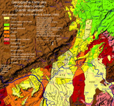 Neben den oben geschilderten sandig-kiesigen quartären Ablagerungen von Rhein und Main bedecken eiszeitliche Lössdecken und im Gebirge Schuttdecken weitgehend die Gesteine des tieferen Untergrundes. Anderle hat 1974 eine abgedeckte geologische Karte vorgelegt, die die Gesteins-Einheiten unter den quartären Sedimenten zeigt. Durch die geologische Kartierung und das Sammeln der Aufzeichnungen von tausenden Bohrungen über mehr als 100 Jahre wird eine Datenbasis geschaffen, die solch eine Auswertung erlaubt.
