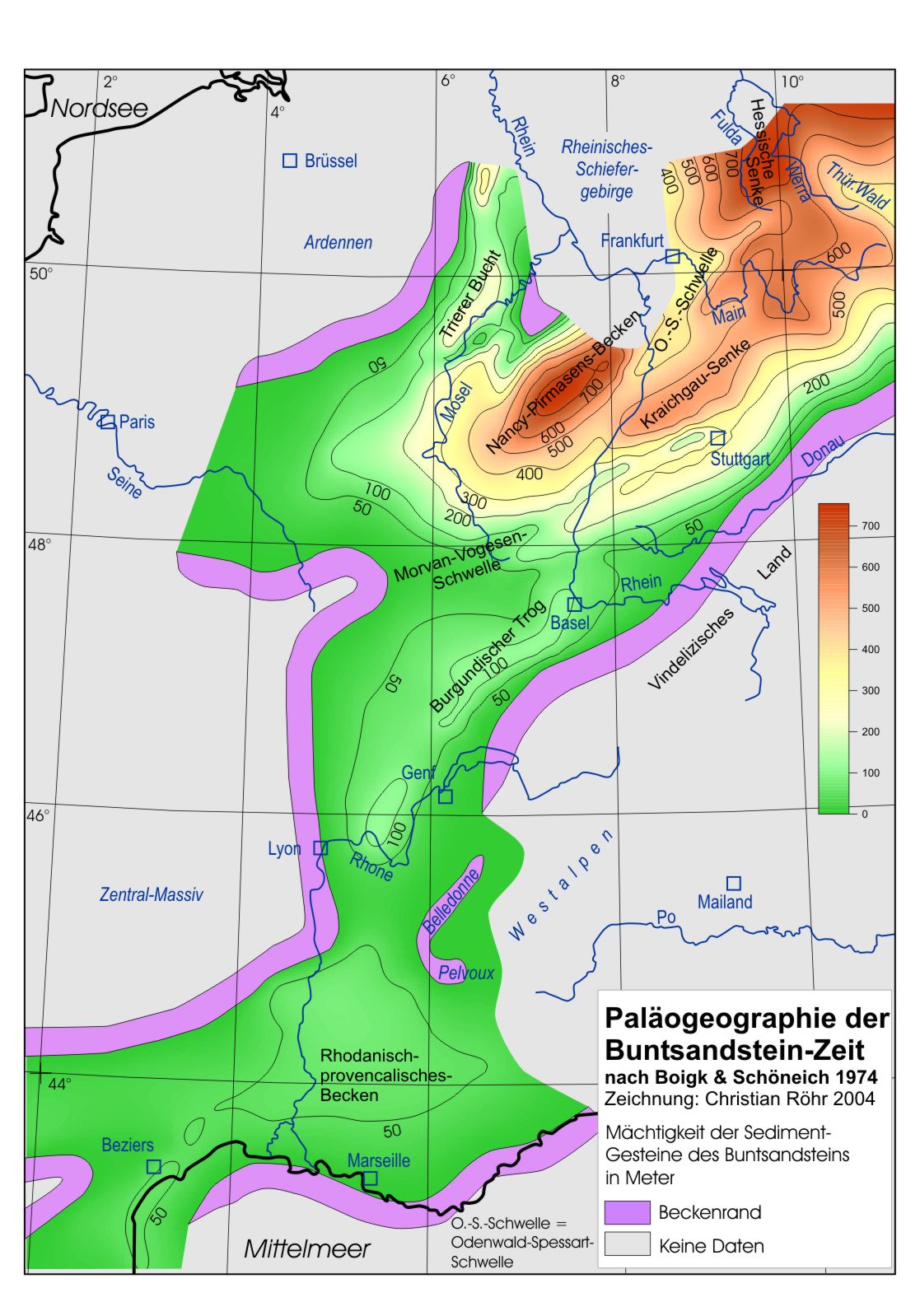 Demgegenüber erscheinen zur Buntsandstein-Zeit unter anderem mit der hessischen Senke, der Trierer Bucht und dem westlichen Rand des Großbeckens Elemente, die Nordnordost-Südsüdwest ausgerichtet sind, also die Richtung, die später auch der Oberrheingraben haben wird. Nördlich von Basel gibt es eine kleine Nord-Süd-ausgerichtete Senke im späteren Oberrheingraben.