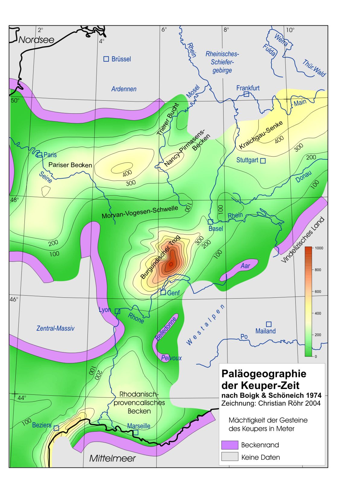 Im Südteil des späteren Oberrheingrabens gibt es schon in der Keuper-Zeit eine Senke, erkennbar durch erhöhte Mächtigkeiten der Keuper-Gesteine. Begrenzt wird diese Senke durch relative Hochgebiete in den Vogesen und im Schwarzwald. Dort ist die Dicke der Keuper-Gesteine deutlich geringer. Im südlich anschließenden burgundischen Trog ist die Mächtigkeit besonders groß. Hier wurden bis zu 700 Meter mächtige Salzgesteine abgelagert.